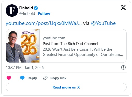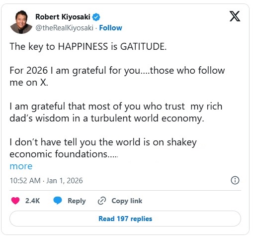他写道:“2026年不会只是一场危机,它将成为我们一生中最伟大的金融机遇。大多数人听到‘变化’这个词会想到危险,而我听到的是机会。”