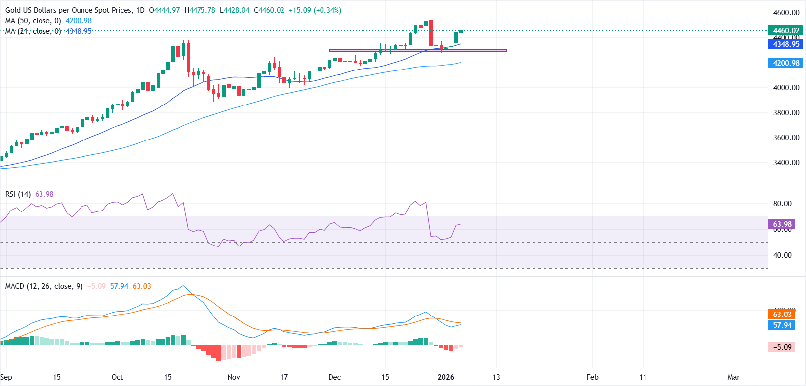 黄金(XAU/USD)在周二盘整,此前一天因美国对委内瑞拉的攻击,避险需求激增,黄金上涨超过2.5%。截至发稿时,XAU/USD交易于$4,460,较日内高点$4,475略有回落。