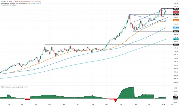 Valencia撰文称,因强劲的美国经济数据抑制避险需求,黄金价格从4500美元/盎司回落。在ISM服务业PMI意外走高,暗示美国经济动能更为稳健之后,金价周三重挫近1%。