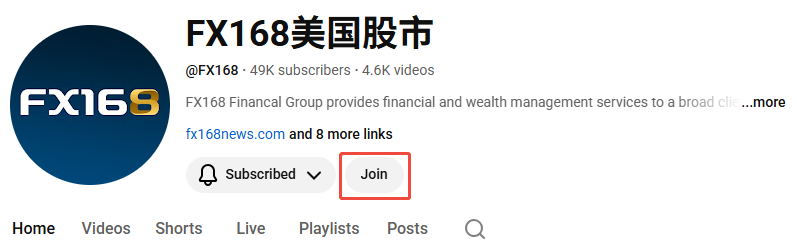 方式A【浏览器】:进入FX168 美国股市频道,点击 “加入“或”Join”按钮。友情提示:由于YouTube渠道限制,iOS版YouTube App通常无法直接开通会员,建议通过手机/电脑浏览器进入频道页面进行订阅。