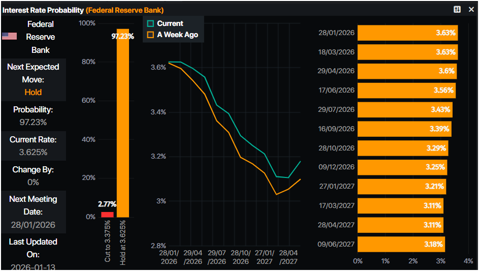 根据Prime Market Terminal的数据,货币市场预计年底前将降息50个基点。然而,在周末,司法部对美联储主席杰罗姆·鲍威尔的起诉发展,威胁到美联储的独立性,降低了1月份会议降息的可能性。