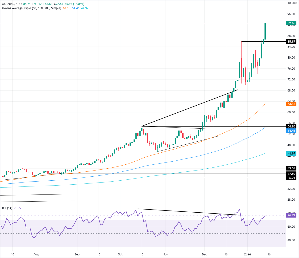 银价在从日低86.91美元反弹后飙升至新纪录高点93.50美元,似乎有望在短期内突破100.00美元关口。截至发稿时,白银/美元交易于93.05美元,飙升超过7%。