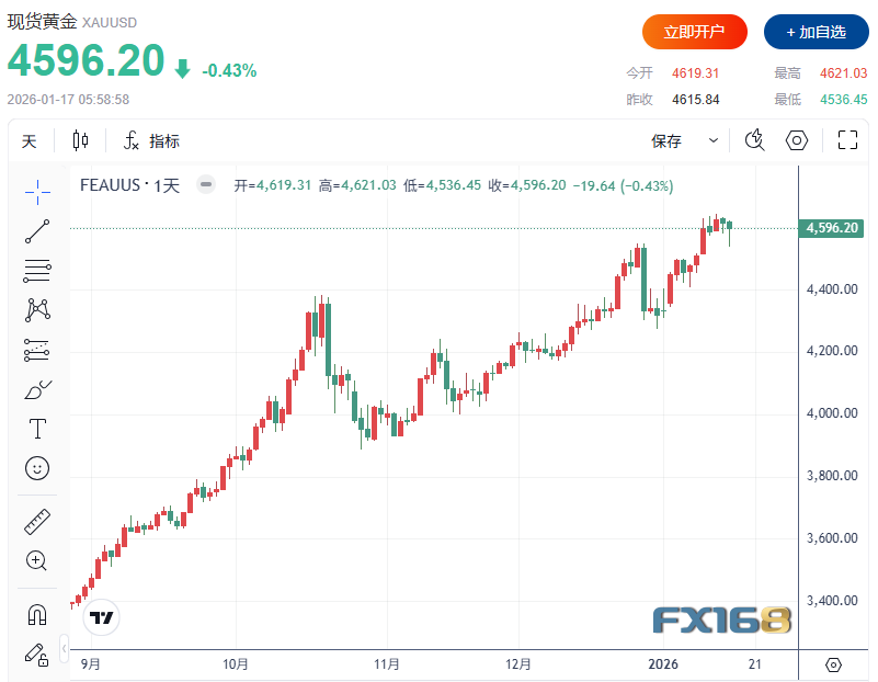 在经历强势上涨后,现货黄金期价周末跌回4600美元/盎司下方。周五(1月16日)美市尾盘,现货黄金收报4596.20美元/盎司,本周上涨87.11美元或1.93%,但较周三盘中高点下跌超1.2%。