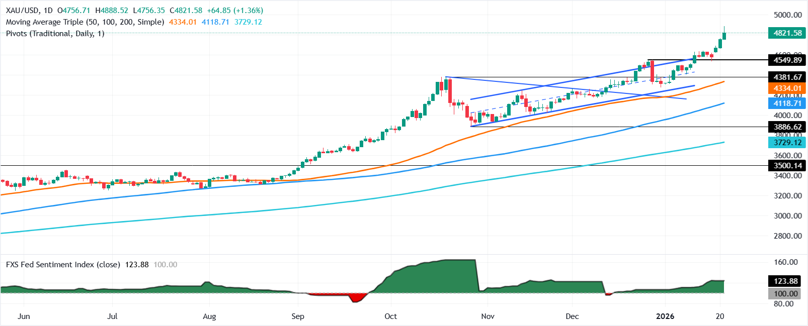 如果黄金/美元在当天收于4800美元以上,这可能为挑战4900美元打开大门。突破后者将为测试5000美元的里程碑打开大门。相反,如果黄金跌破4800美元,首个支撑位将是1月20日的高点4766美元。一旦突破,下一步将是4700美元。