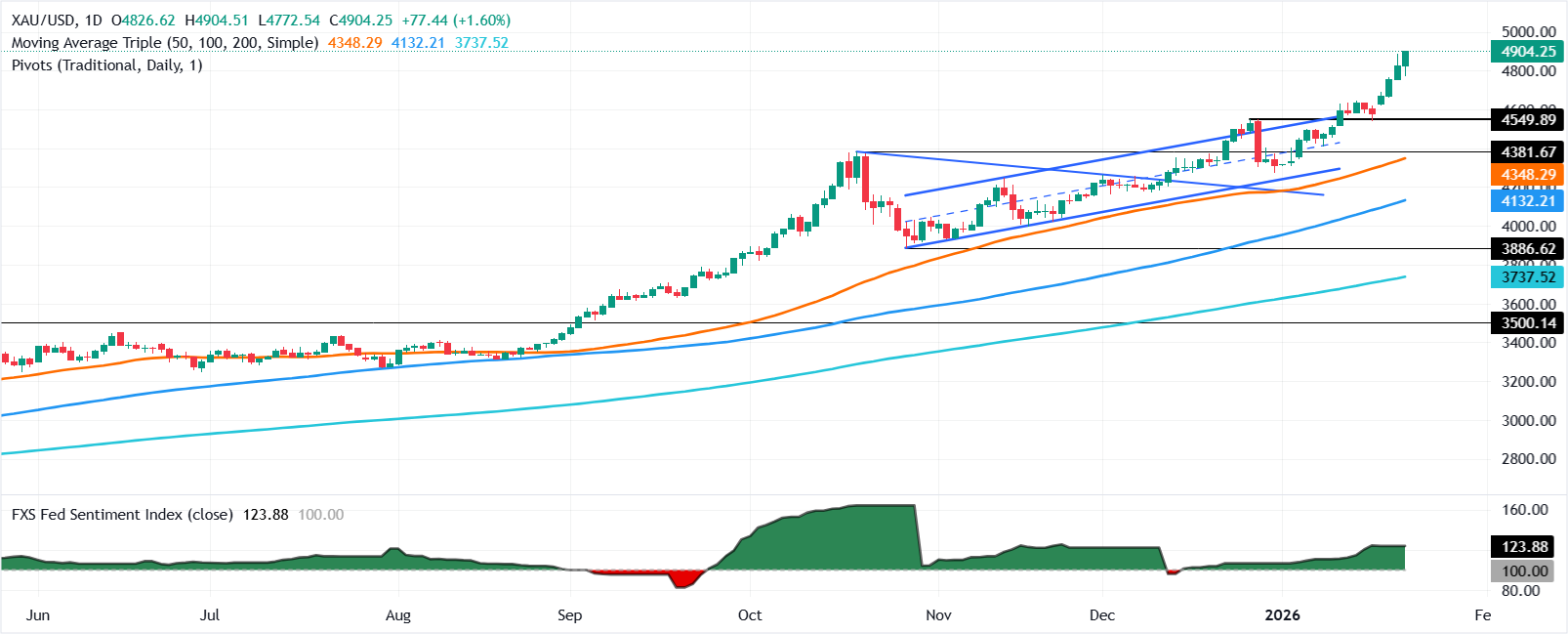 - 黄金 突破 4,900 美元,尽管风险偏好改善,因美欧紧张局势缓解。