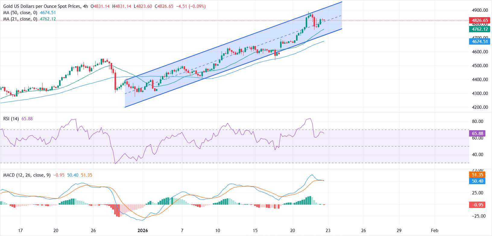 在下行方面,4800美元心理区间是第一条支撑线。若持续跌破该区域,将暴露出21期SMA附近的4762美元,随后是50期SMA约4674.50美元。