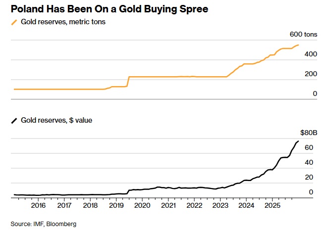 波兰央行行长亚当·格拉平斯基(Adam Glapiński)一直在推动提高黄金储备上限的努力,黄金储备在2025年底已达到550吨。直到现在,波兰央行最多可以将其总储备的30%分配给黄金,而飙升的黄金价格使黄金在储备中占比约28%。