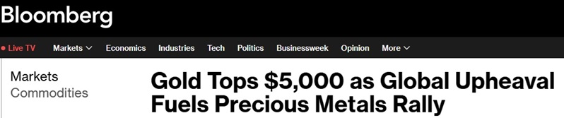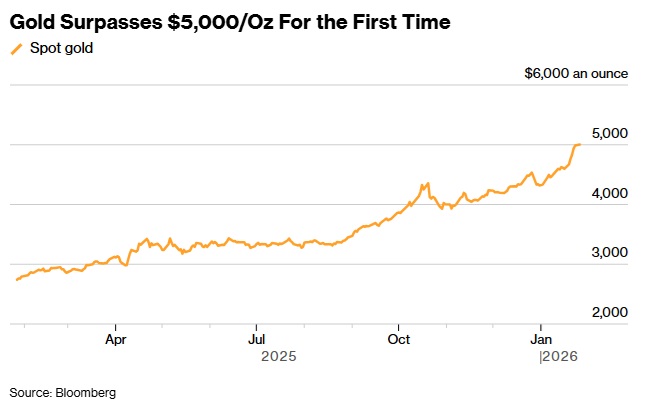 美国彭博社分析称,黄金价格首次突破5000美元/盎司,延续了由美国总统特朗普(Donald Trump)重塑国际关系以及投资者逃离主权债券和货币所推动的急剧上涨。