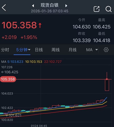 周一,白银也创下了历史新高。银价一度突破106美元/盎司大关,最高触及106.425美元/盎司。