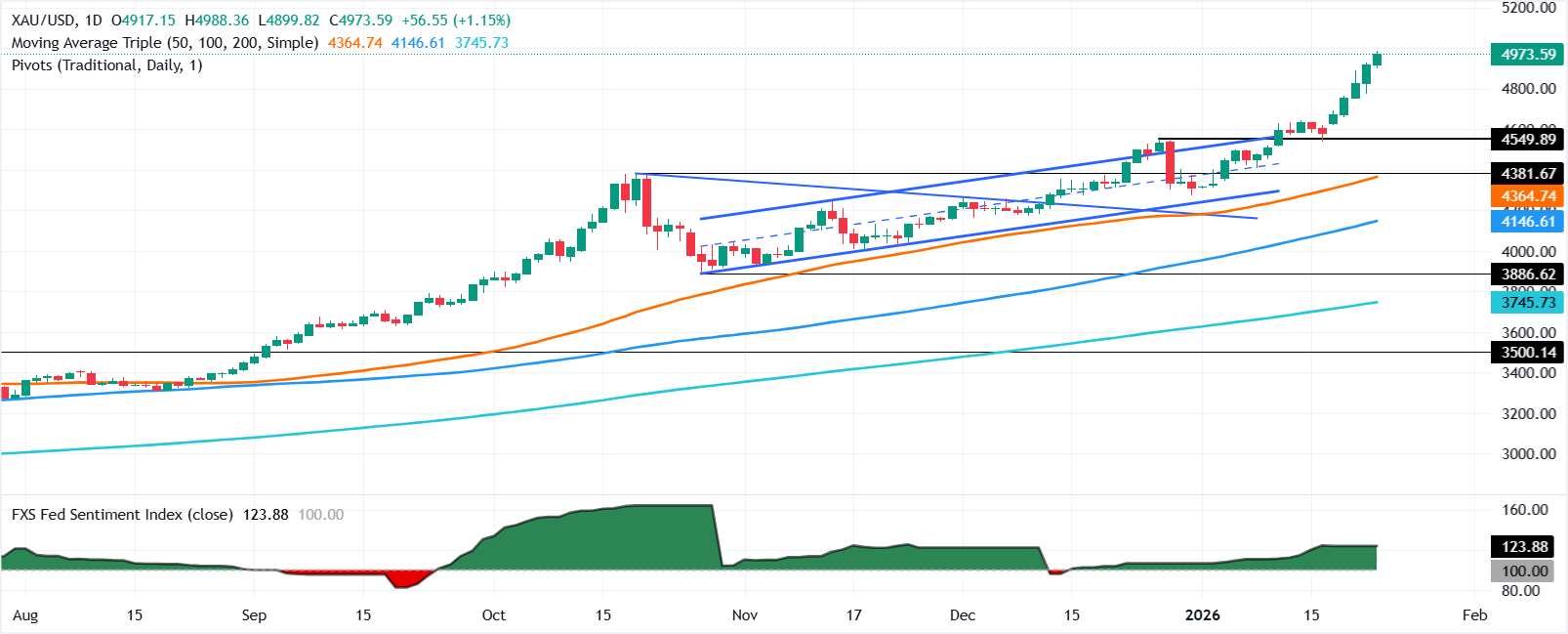 黄金的抛物线上升趋势已延续至第五天,黄色金属有望挑战5000美元大关。价格走势依然积极,且多头继续积聚动能,尽管相对强弱指数(RSI)处于超买状态,但仍突破了最新高点,表明上升趋势依然强劲。