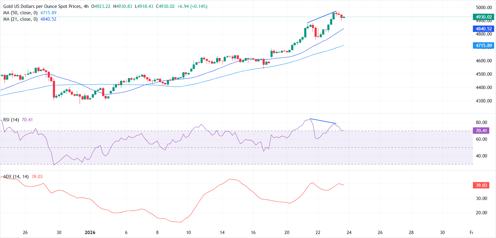 黄金(XAU/USD)在周五小幅回落,因为在亚洲时段早些时候飙升至接近$4,967的历史新高后,轻微的获利回吐开始显现。撰写时,XAU/USD徘徊在$4,930附近,预计将实现连续第三周的上涨。